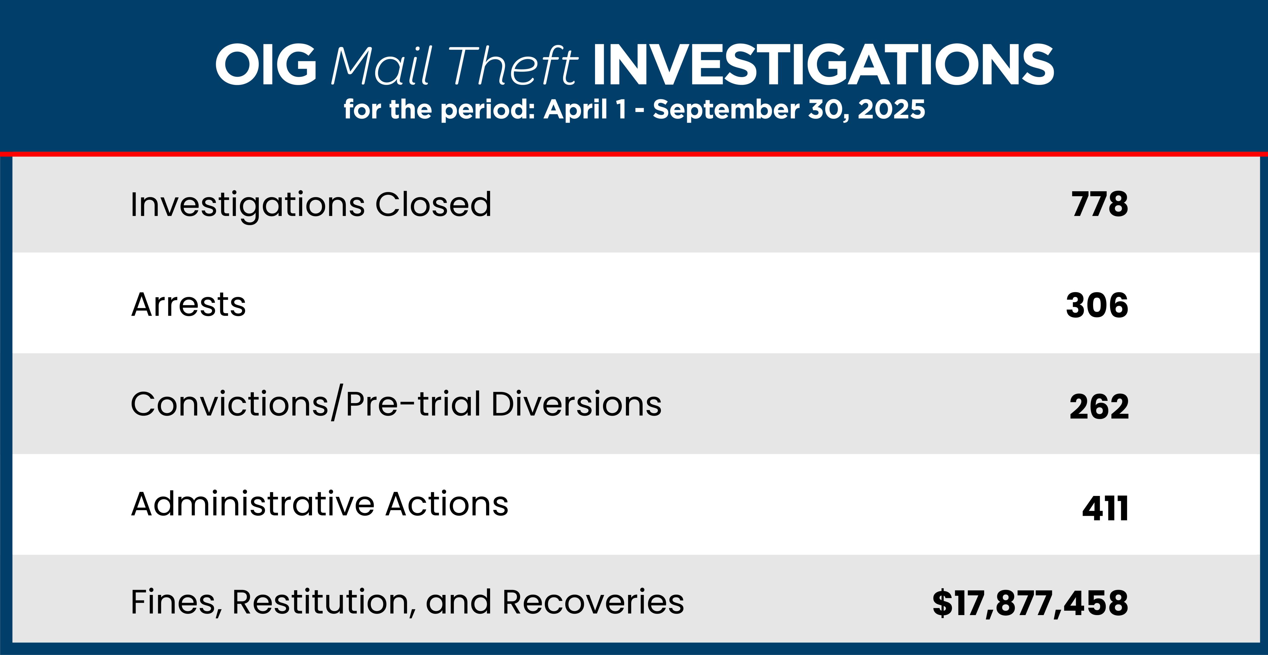 Beyond our investigative work to combat postal crime, our report highlights a white paper on mail theft and a management alert our auditors issued after they visited the contractor-operated Denver Regional Transfer Hub. There, postal management expressed concern that contractors were opening Priority Mail Open and Distribute sacks to pilfer medications. We recommended USPS prioritize insourcing the hub’s operations and it agreed. This is but one example of how our Office of Audit finds system vulnerabilities that may aggravate mail theft.