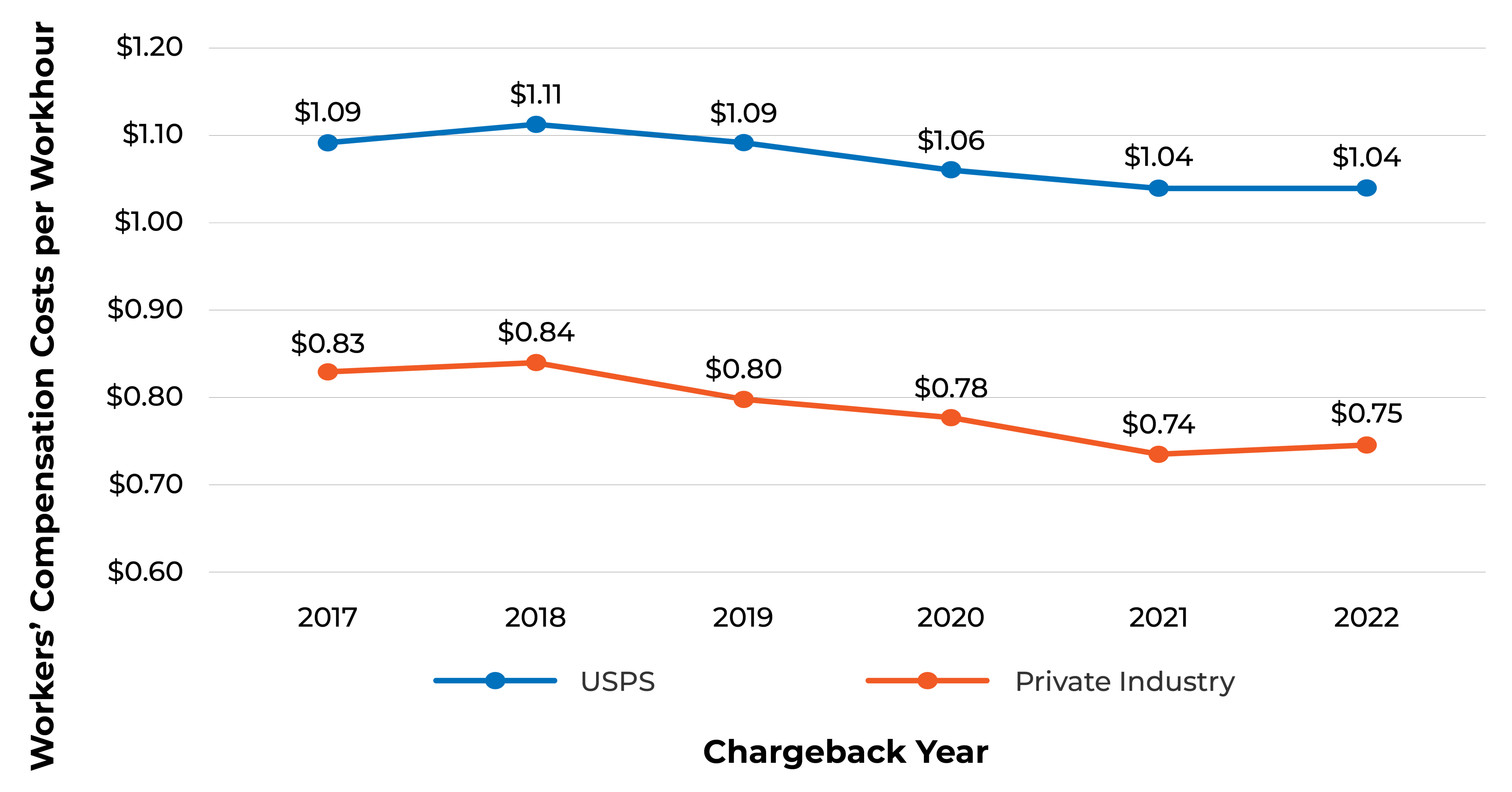 Postal Service and Private Industry Workers’ Compensation Cost per Workhour between CBY 2017 and CBY 2022