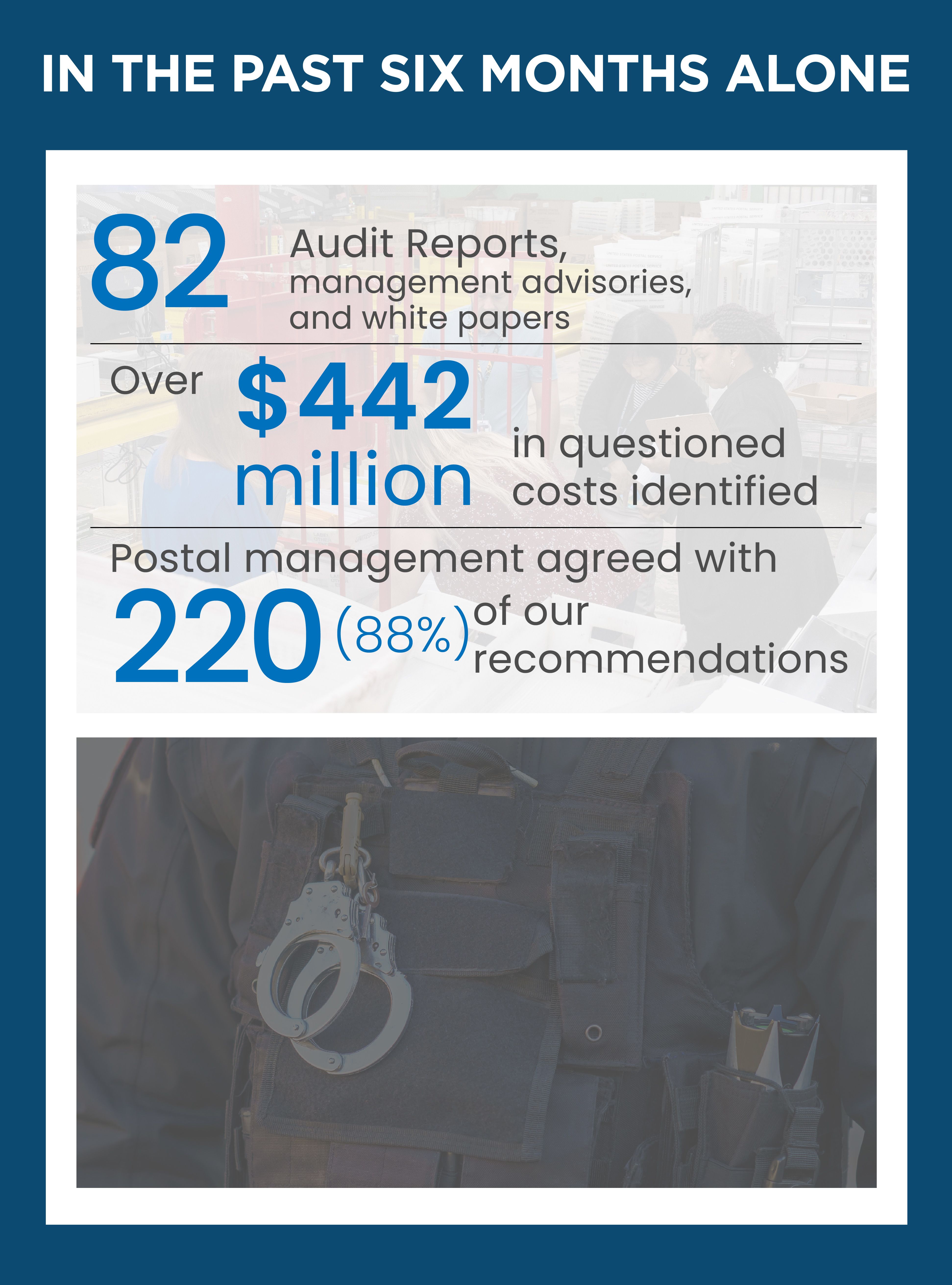 In the past six months alone, we issued 82 audit reports, management advisories, and white papers, and identified over $442 million in questioned costs. Postal management agreed with 220 (88%) of our recommendations to improve issues we identified. Our special agents completed 1,393 investigations that led to 401 arrests, 351 convictions, and almost $19 million in fines, restitution, and recoveries, of which more than $11 million was returned to the Postal Service.