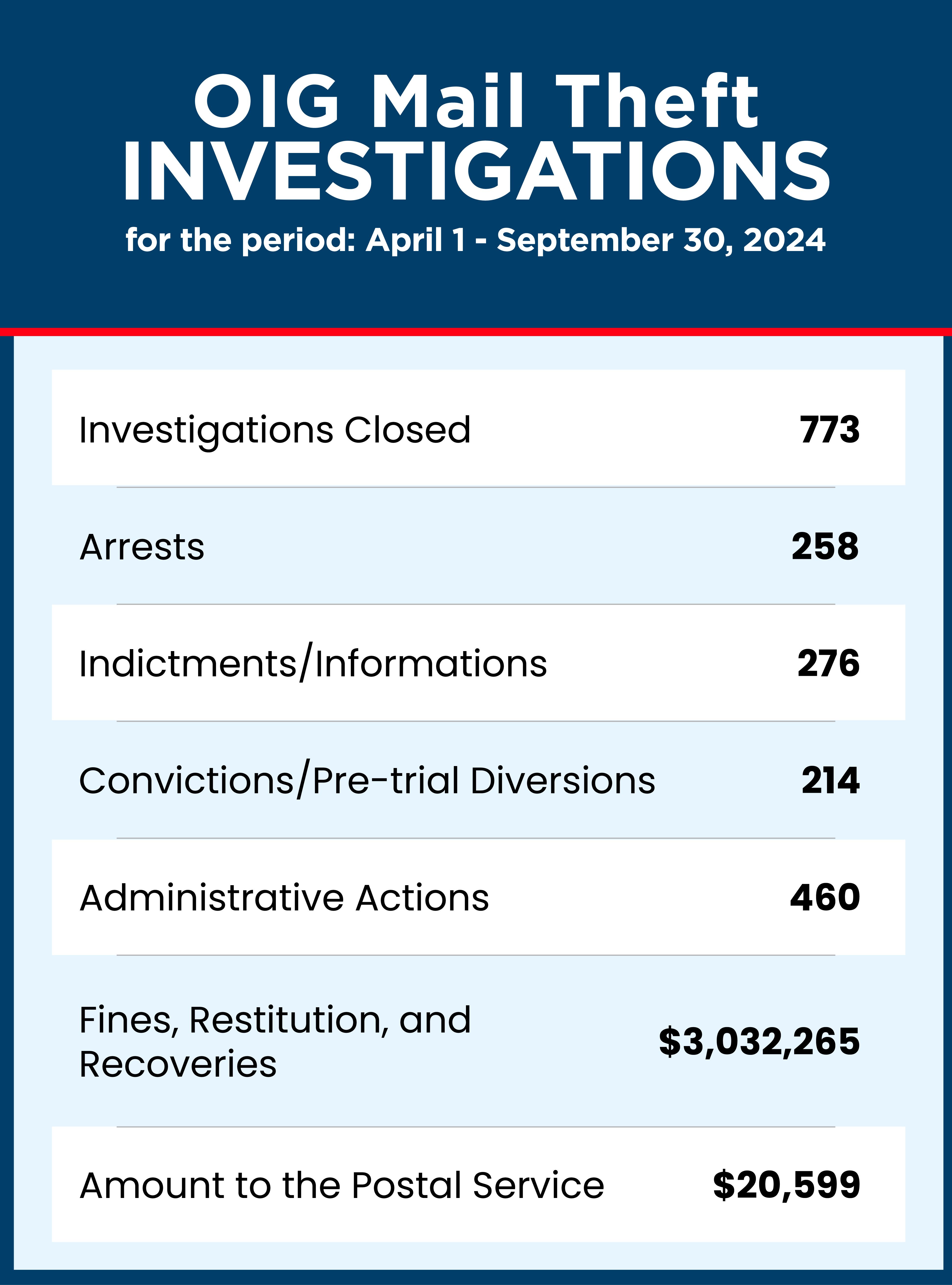 Our special agents also stopped a multi-state mail theft conspiracy and brought down a conspiracy to steal fraudulently issued IRS tax refund checks and CARES Act Economic Impact Payment checks. You can find these and other cases, along with a summary of our oversight of USPS’s efforts to combat mail theft in our Semiannual Report.
