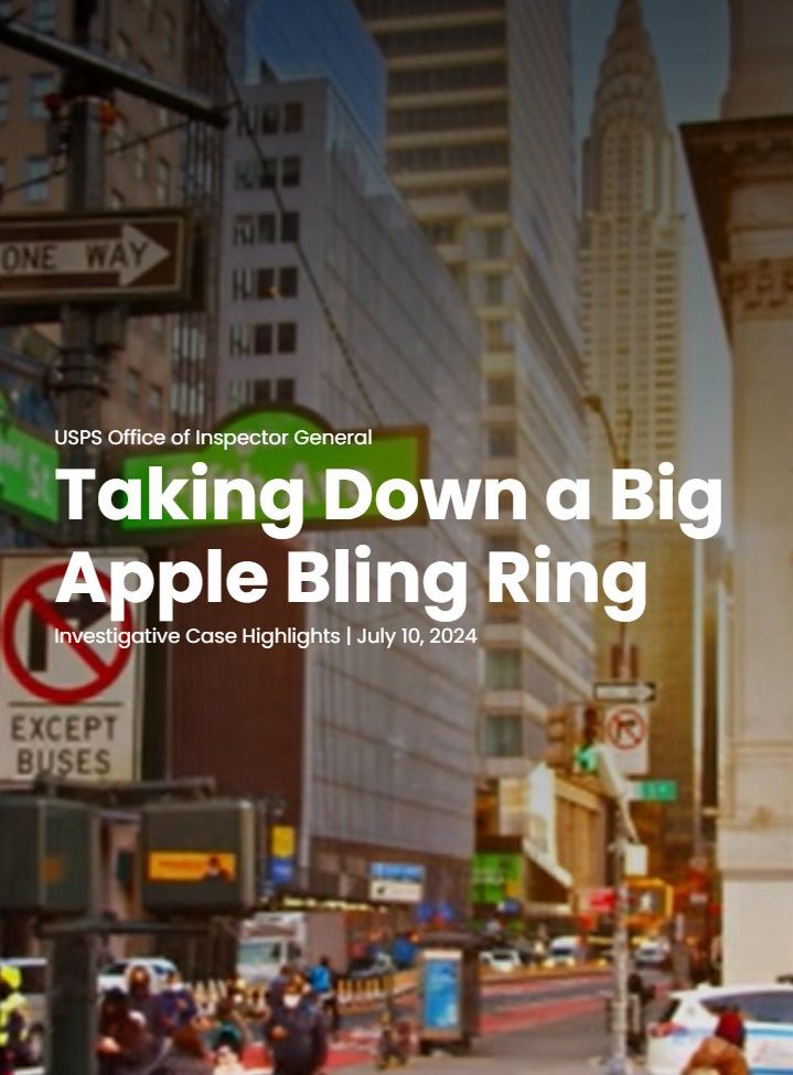 One of our digital stories immerses readers in a case where our special agents took down a 10-person New York City bling ring. Four co-conspirators were postal employees who stole over 1,000 credit cards issued by one of the country’s largest credit card companies. The others would then use the cards to buy luxury items around the Big Apple.