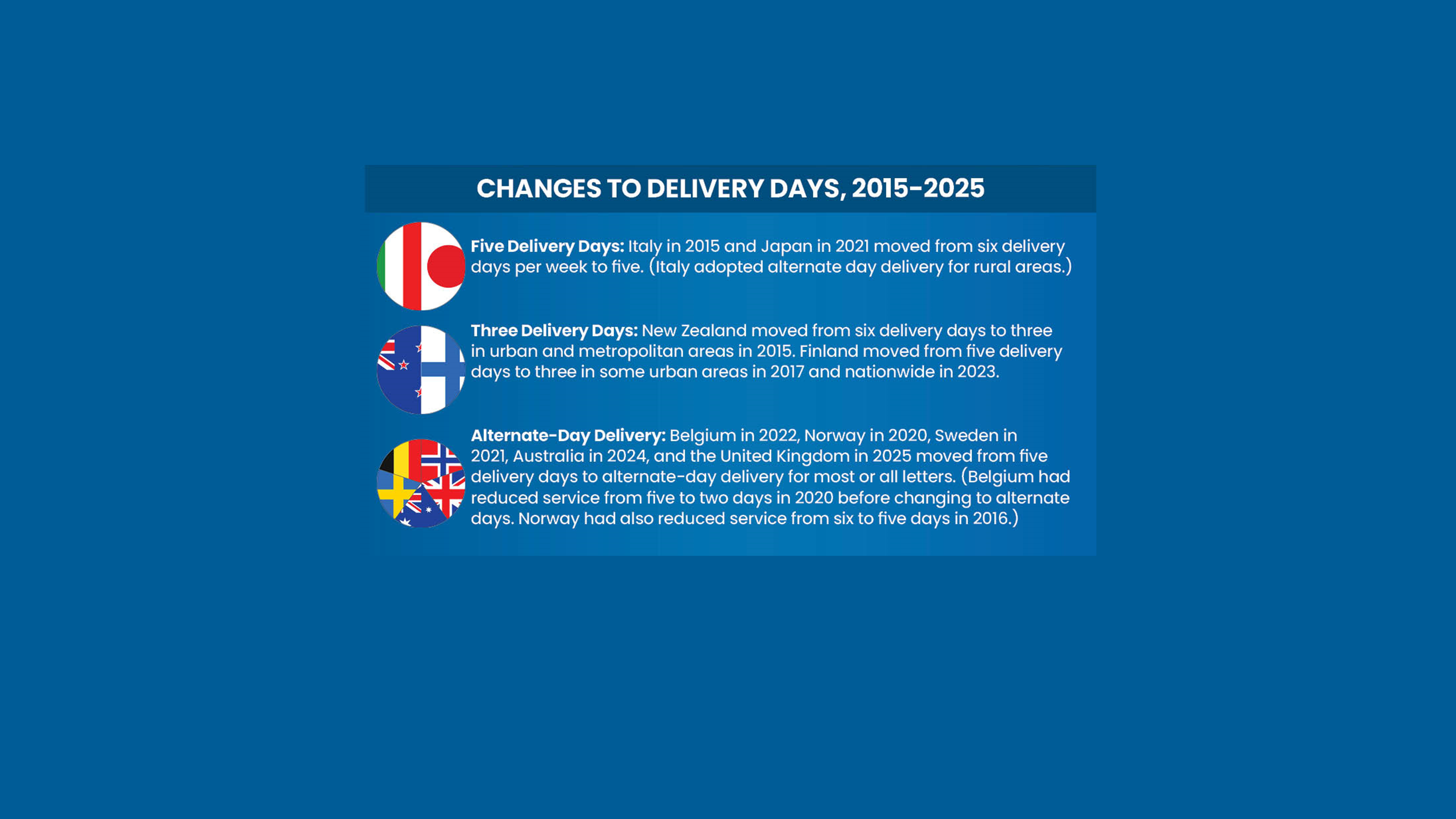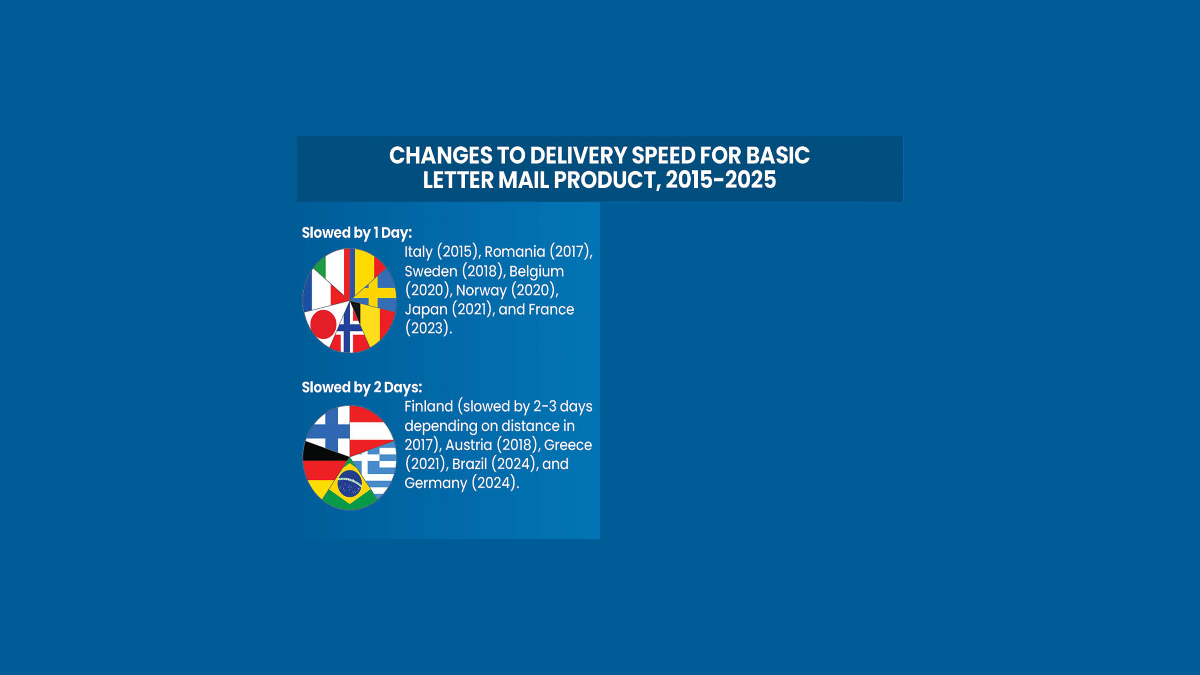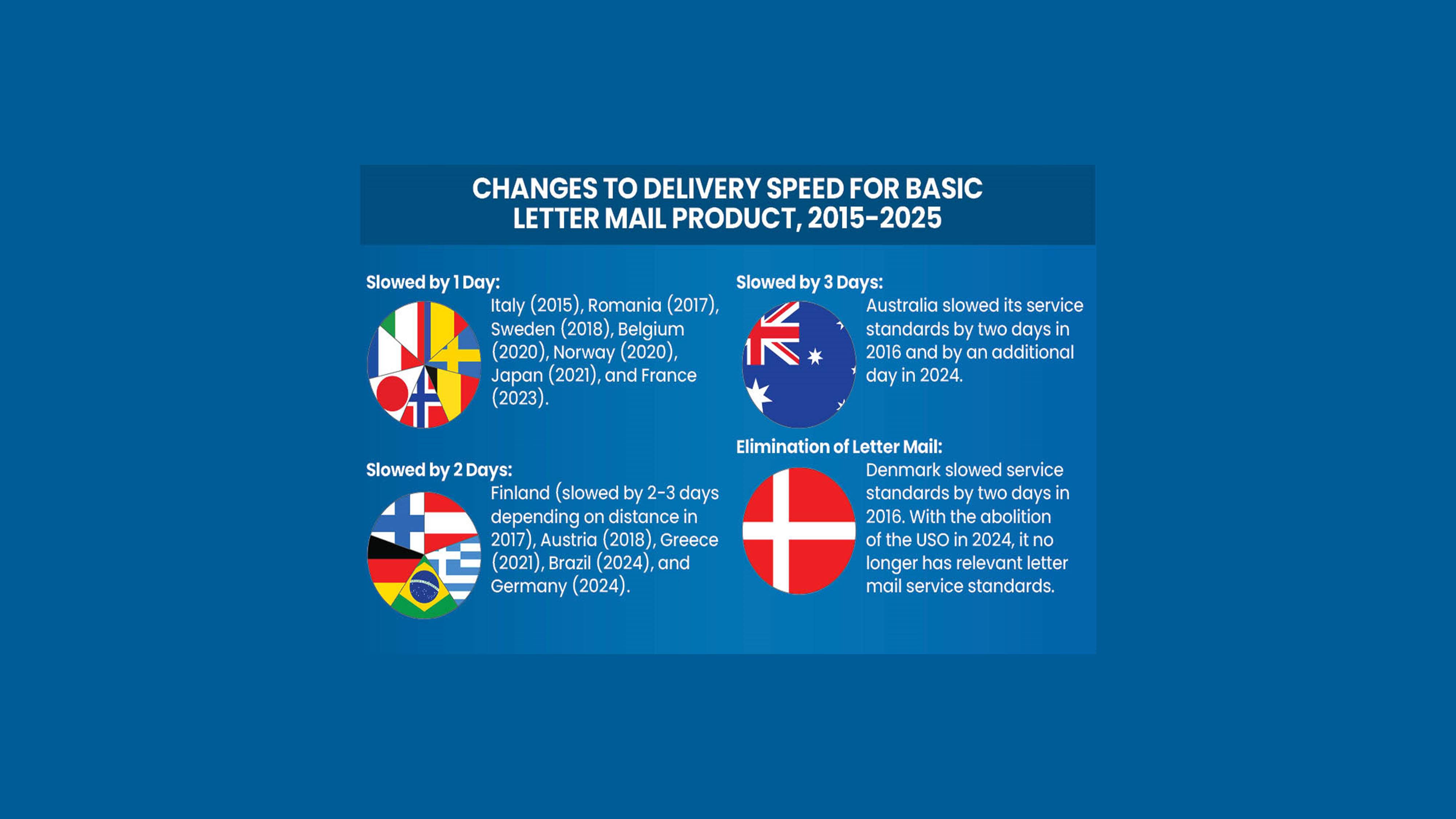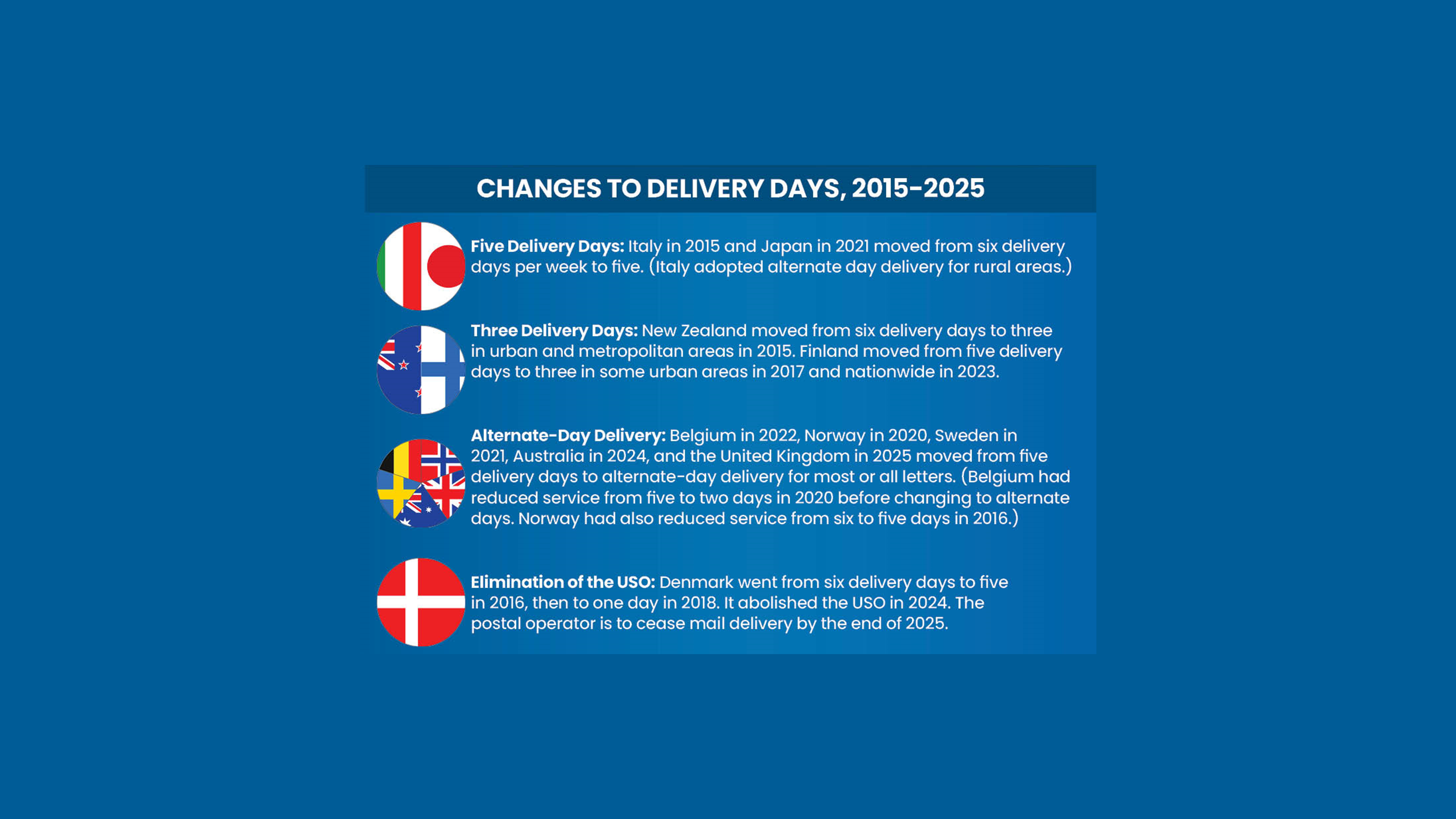 The changes fall into four categories: delivery days, delivery speed, postal retail networks, and scope of USO products.