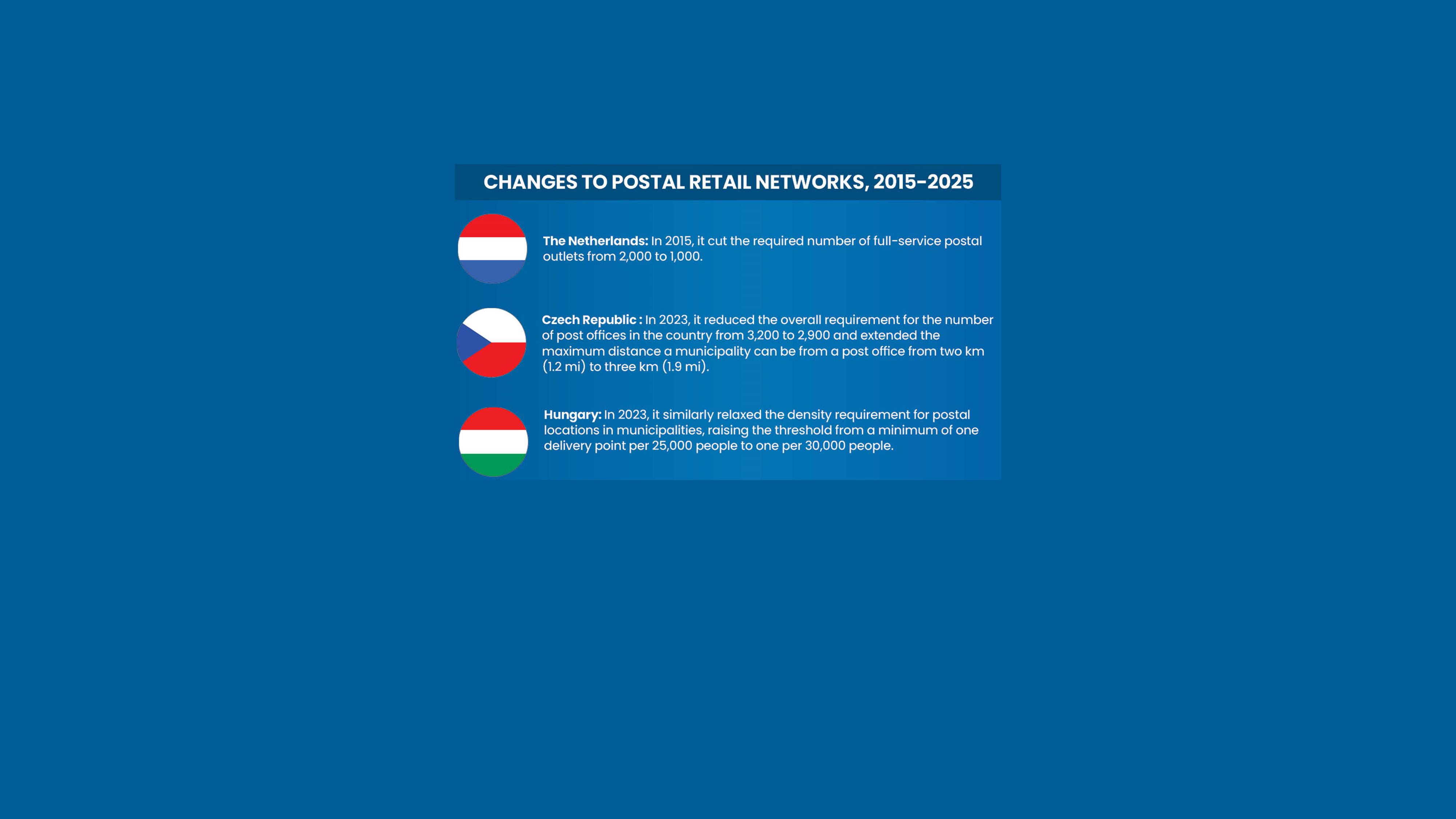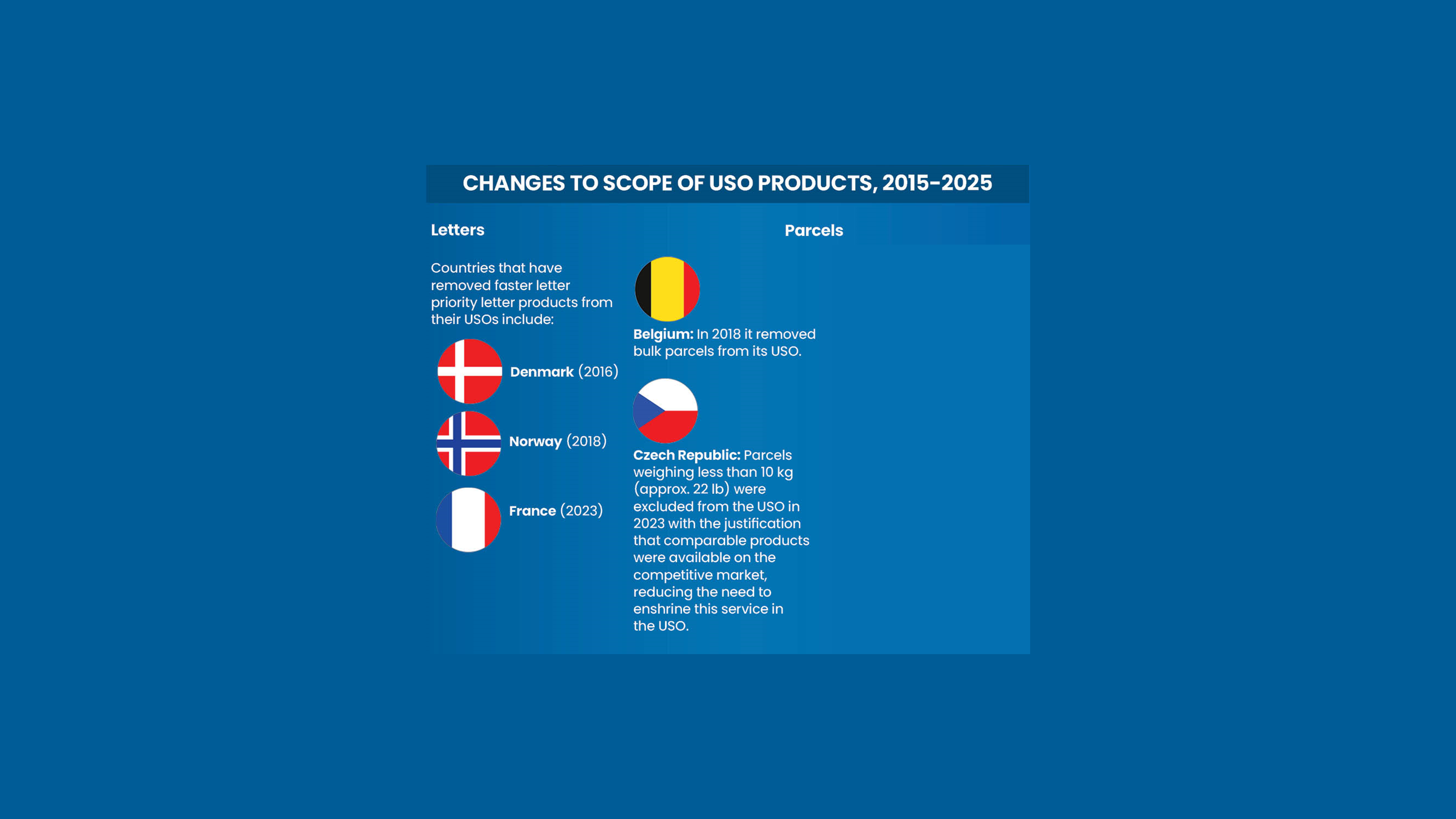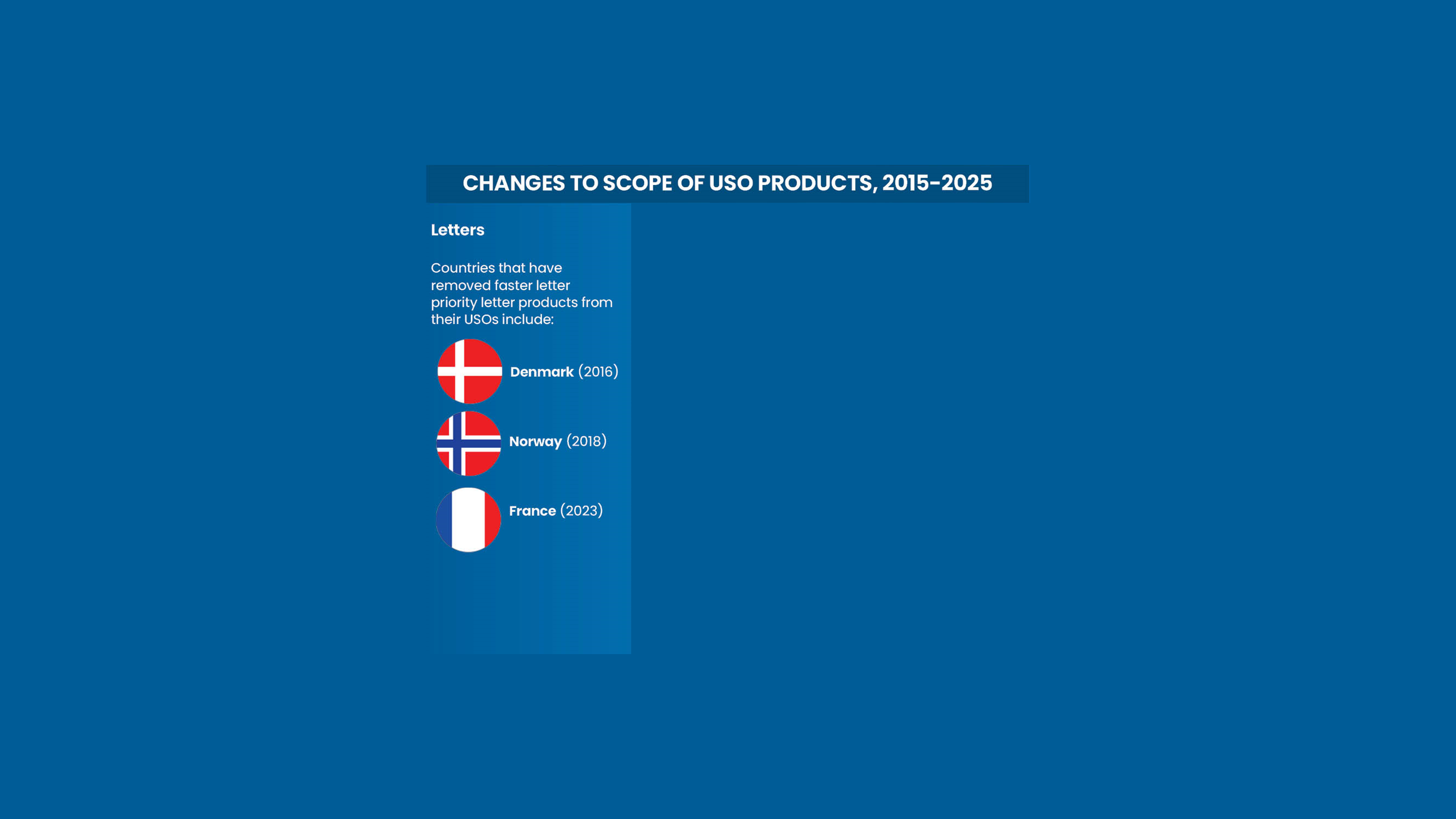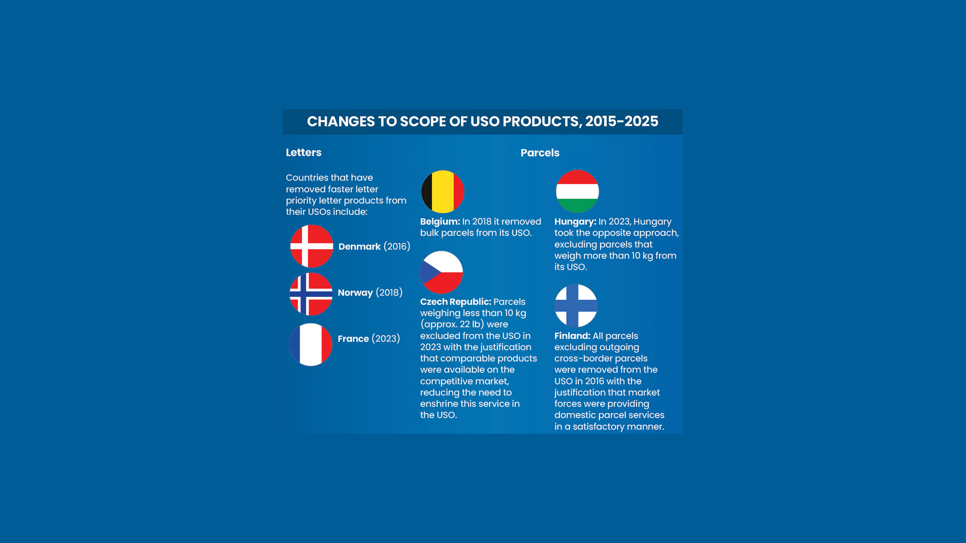 - While modifying the USO helped some countries reduce costs, it was not always enough to ensure the long-term sustainability of postal services.