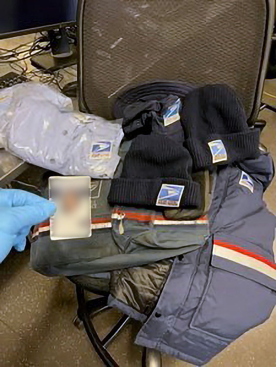 The suspect's USPS uniform, ID, and other branded items found in her vehicle. Source: HSI.