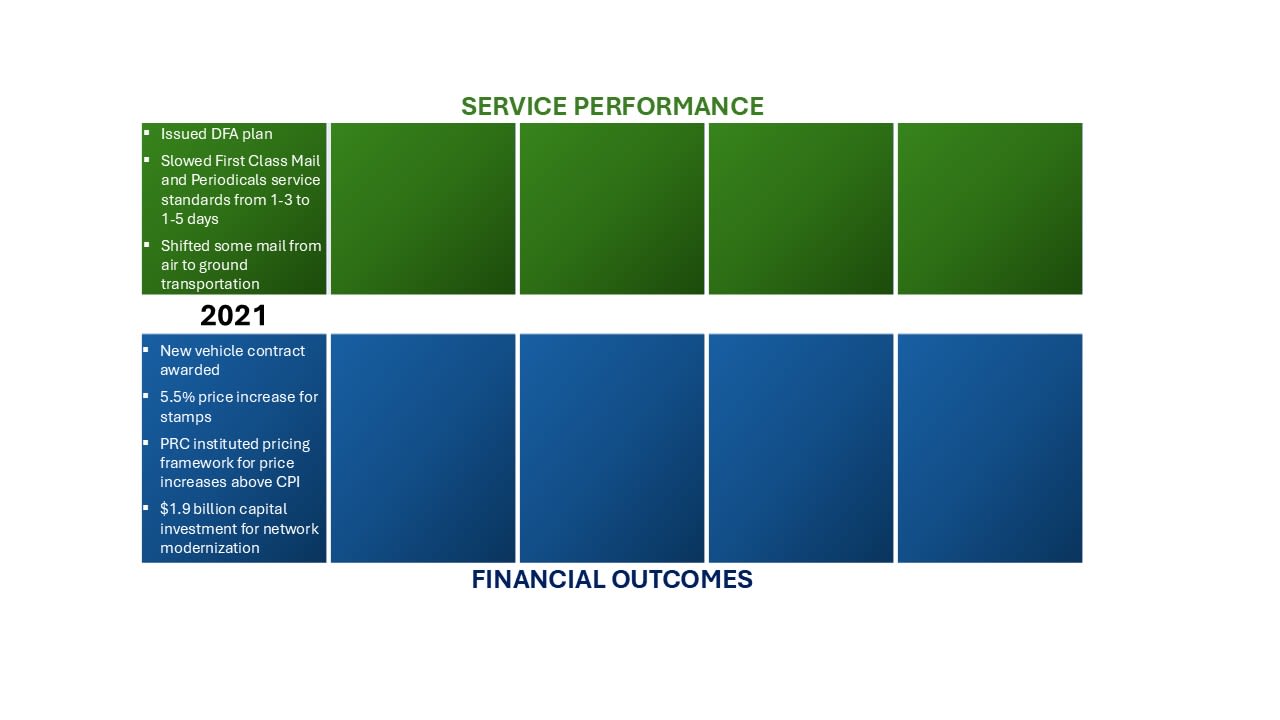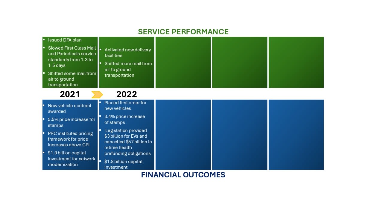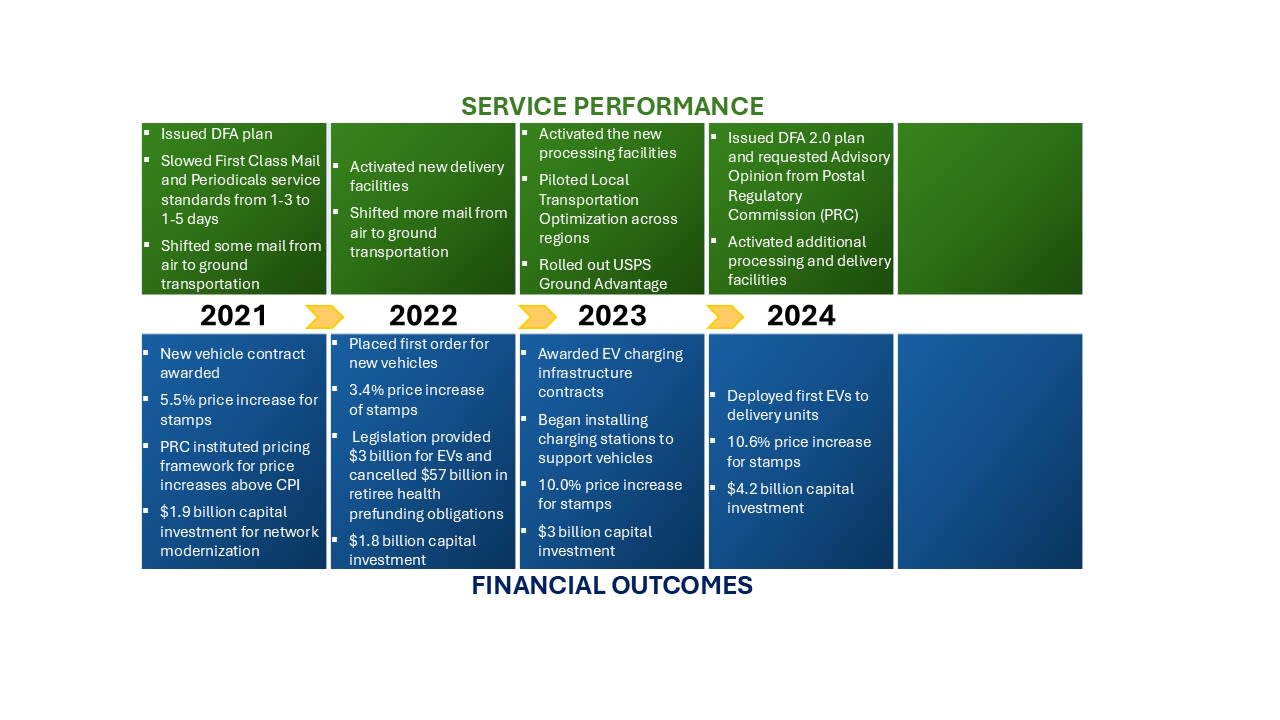 In the short term, these efforts have brought trade-offs, such as slower service, missed targets, and a network still in transition. Recognizing these challenges, the new postmaster general has emphasized the importance of service and the need to continue modernization, ensuring that transformation delivers not only cost savings but also reliable service for the American public.