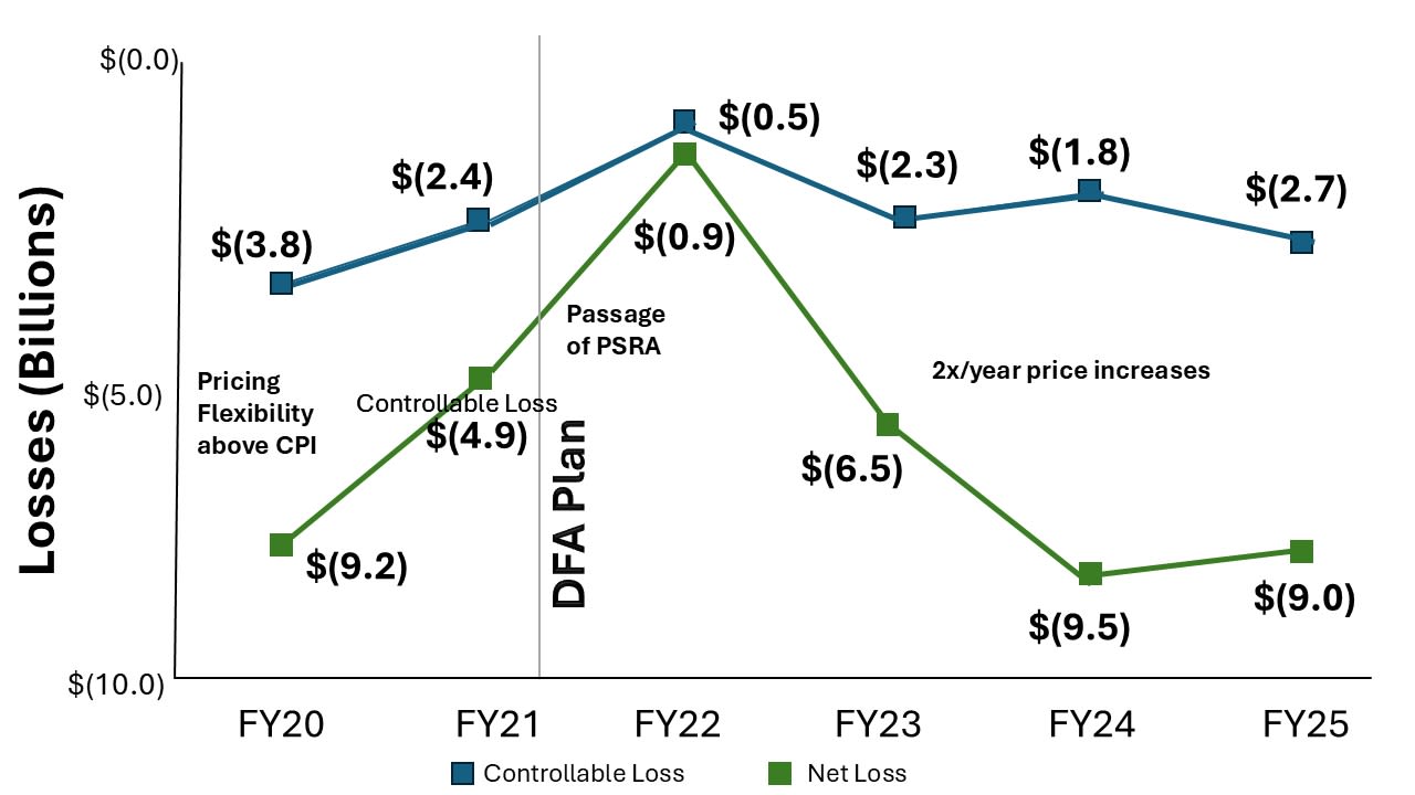 The Postal Service’s preferred method for analyzing its financial condition is its controllable income or loss. As seen to the left, the difference between controllable losses and net losses from operations is significant, demonstrating at least in part, the financial impacts associated with required participation in federal retirement and workers compensation programs.