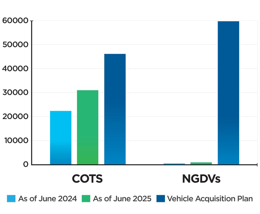The Postal Service’s is in the process of buying specialty-made Next Generation Delivery Vehicles (NGDV) over 10 years, while also continuing to use and purchase commercial-off-the-shelf (COTS) vehicles. The progression of the acquisition plan is shown below:
