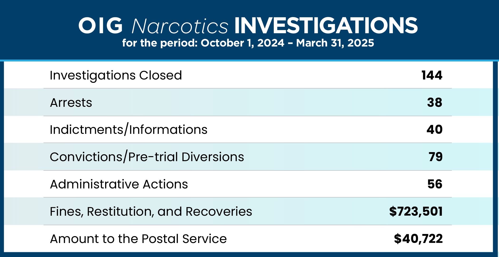 Our report highlights other significant narcotics cases we closed during this reporting period. And if you’d like to learn more about the work our special agents do — not just in mail theft and narcotics, but also in contract, financial, and health care fraud — you’ll enjoy reading our Investigative Case Highlights.
