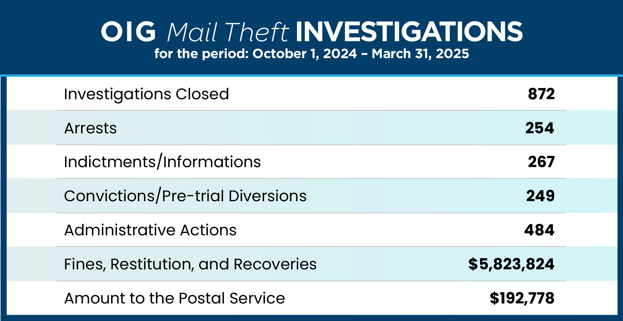 In recent years, we’ve seen a rise in criminal organizations that target postal employees to steal financial instruments from the mail, such as checks, credit cards, and debit cards. In this reporting period, our special agents closed 872 internal mail theft investigations, including some that were unabashedly harmful to both the Postal Service and its customers.