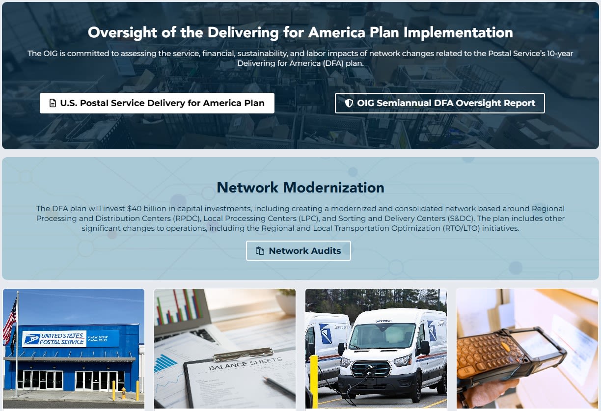 The Postal Service is in the fourth year of its 10-year Delivering for America (DFA) plan, which outlines significant changes to many parts of the agency’s operations, including redesigned processing, transportation, and delivery networks. A substantial part of our audit work is overseeing USPS’s progress on all DFA initiatives.