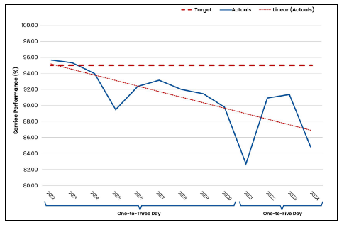 USPS has struggled to meet the service standards for First-Class Mail since fiscal year (FY) 2013 as seen in the graph below.