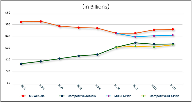 The DFA plan includes $24 billion in revenue improvements, $34 billion in management cost savings, $44 billion in regulatory changes, and $58 billion in legislative and administrative actions to improve financial performance.