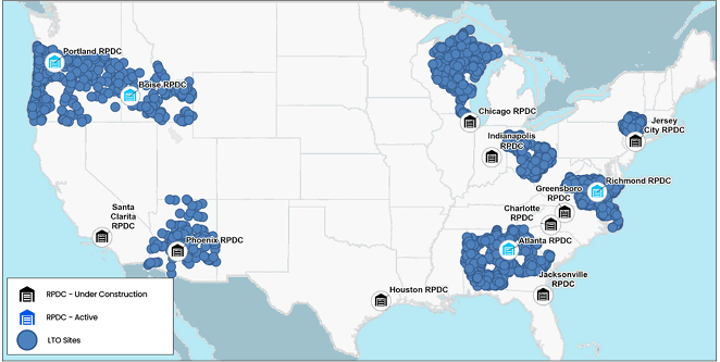 USPS' Local Transportation Optimization (LTO) initiative, now known as the Regional Transportation Optimization, which reduces transportation trips to and from select delivery units from 2 to 3 trips per day to 1 trip, was rolled out at over 2,000 sites, as of the end of July 2024 and seen in the map below.