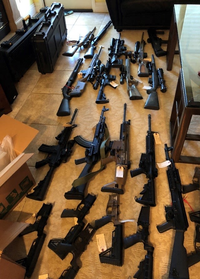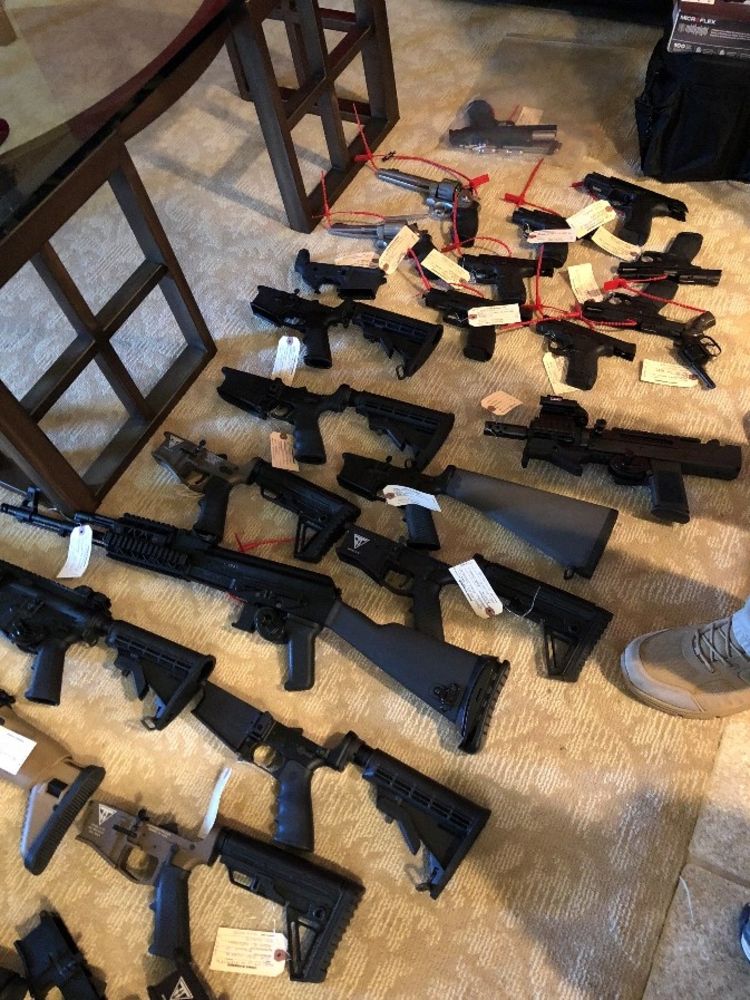 Investigators tracked down three properties associated with the brothers and executed search warrants. There, local tactical teams found about $100,000 in cash, $100,000 in jewelry, and over 60 firearms (pictured) that became part of the asset forfeiture. They also found about 155 pieces of mail containing USPS claims remittance checks and over 100 empty claims remittance check envelopes.